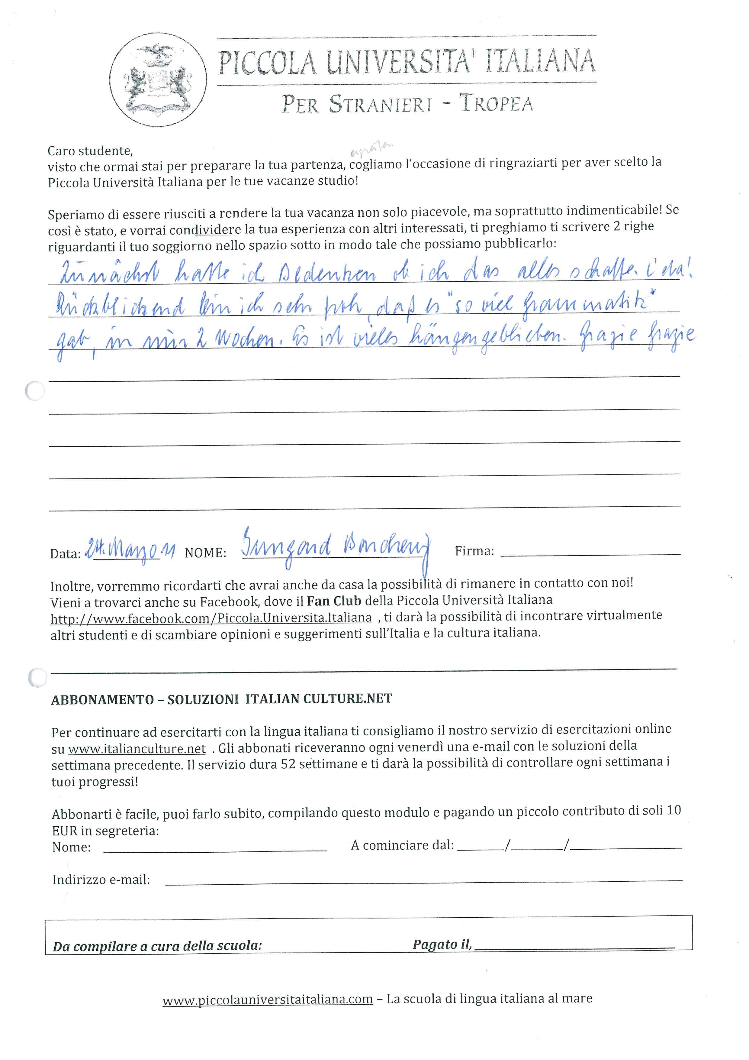 Le mie 4 settimane alla Piccola Università Italiana mi sono piaciute molto. Specialmente la professionalità delle insegnanti mi sono impressionata. C'era un ambiente famigliare tra gli studenti e le insegnanti.