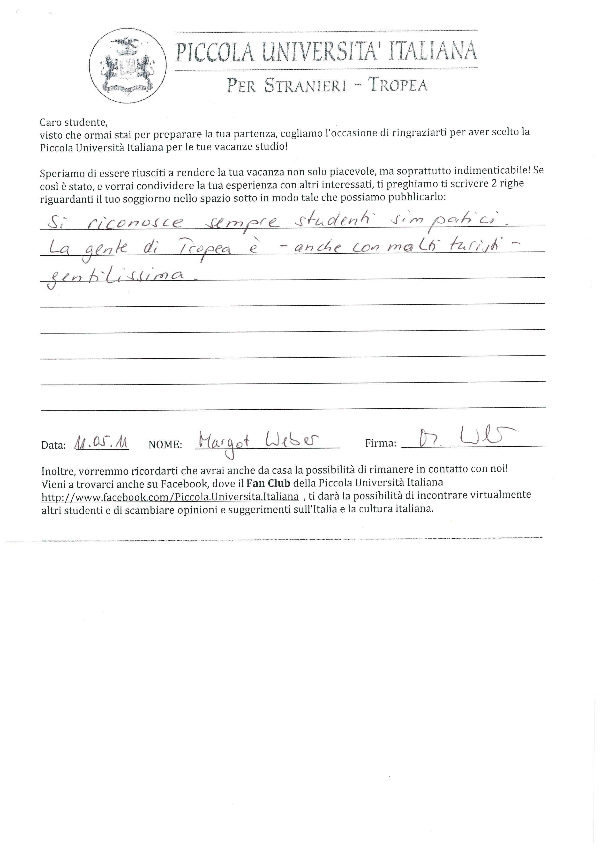 La terza volta alla Piccola Università è stato di nuovo una esperienza molto pieno di soddisfazioni. E' necessario vedere al soggiorno in totale. La scuola, gli insegnanti, la cittadina e gli abitanti di Tropea, tutti fanno l'esperienza indimenticabile!